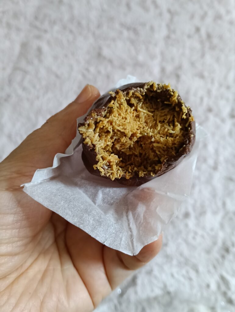 外は歯ごたえのあるもちもちチョコ味マシュマロで、中身は濃厚なピスタチオクリームと、バターで炒めたカダイフのザクザク食感がぎっしり詰まっています。